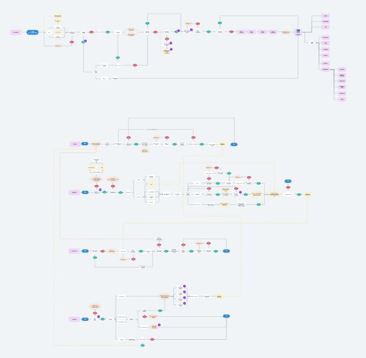 With a big-picture of the most known problems, I could start to work on the user flows. We had a lot of sub-flows and interconnections between features and processes that would be realized in and out of the app, so, I start to map all these happy and sad paths of interactions: