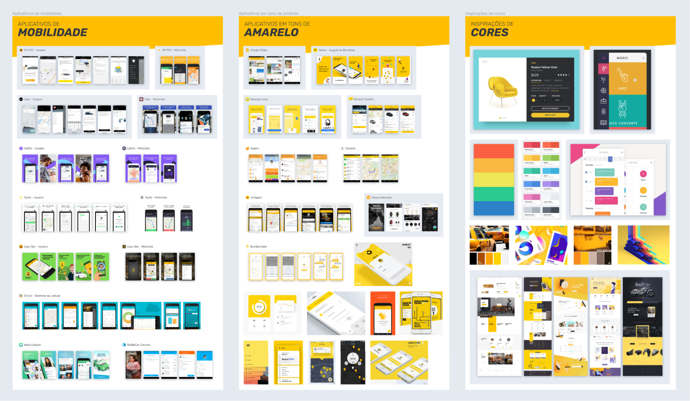 The founders of SOHA would like to preserve the Yellow/Orange approach in the app concept, so I made some studies of other mobility apps, other yellowish apps, and some harmonic combinations.