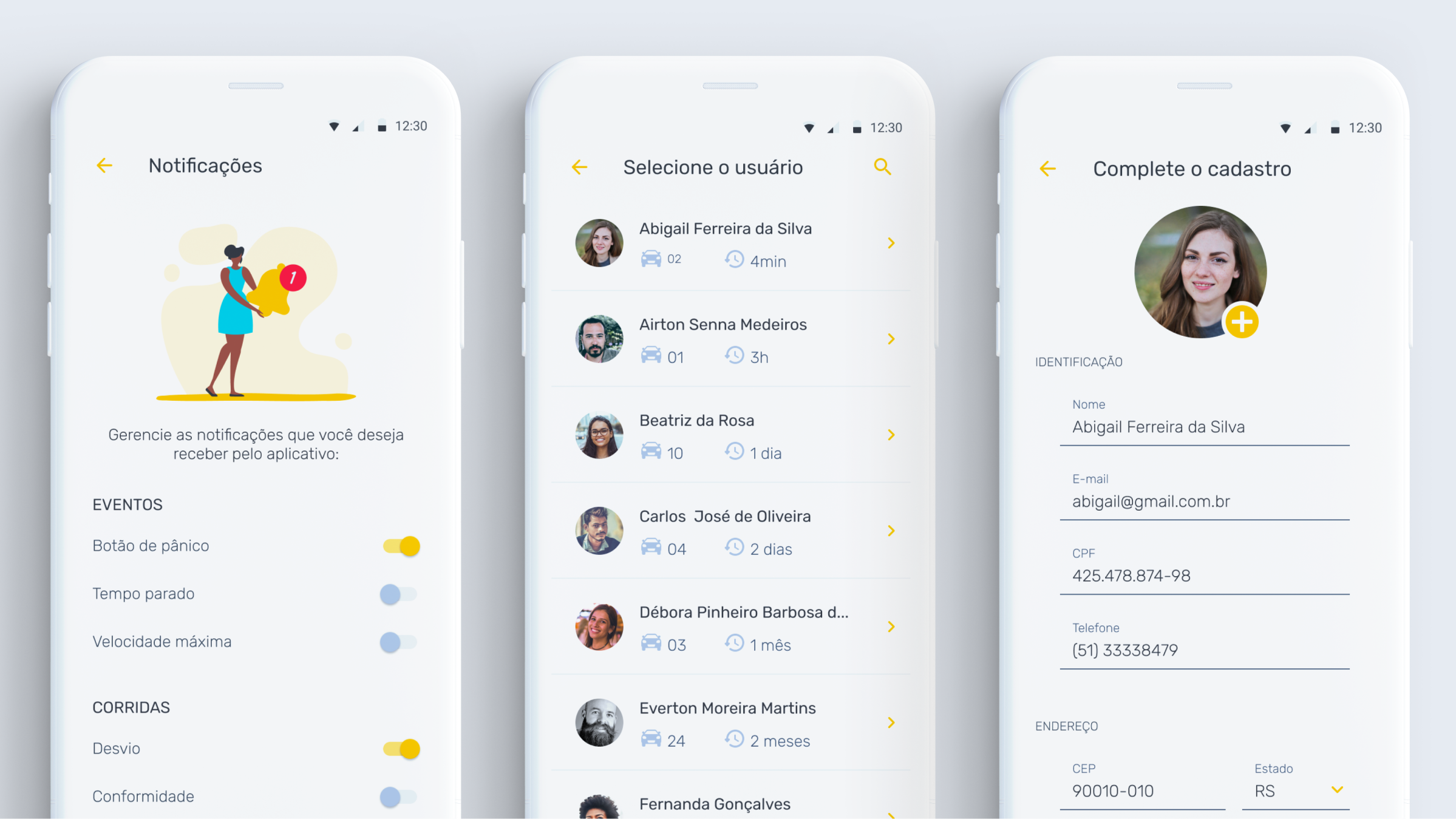 From left to right: Users can control which notifications they would like to receive; fleet managers with admin permissions can have a ’view as’ access to monitor and help their drivers; register is facilitated by Social Media but in case of edit information, the forms are accessible and clear.