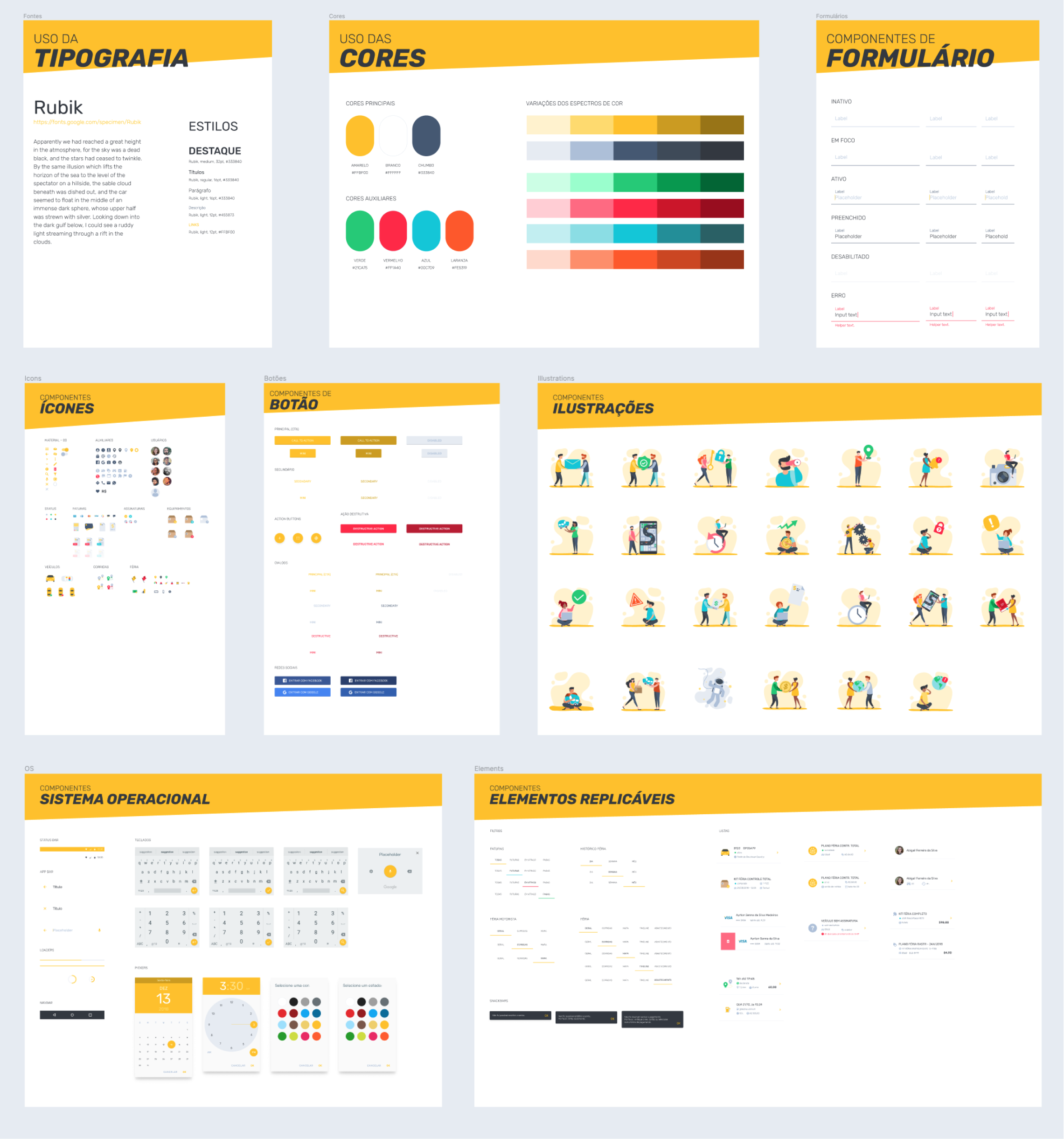 Visual consistency and optimization of resources are the keys to good use of Design Systems. After setting colors, typography, and illustration direction (filled or outlined icons, simple or complex pictograms, colorful or monochromatic, images or vectors, etc.) we have a range of possibilities. In this case, the application was native Android, so, you can see a lot of Material Design inspiration.